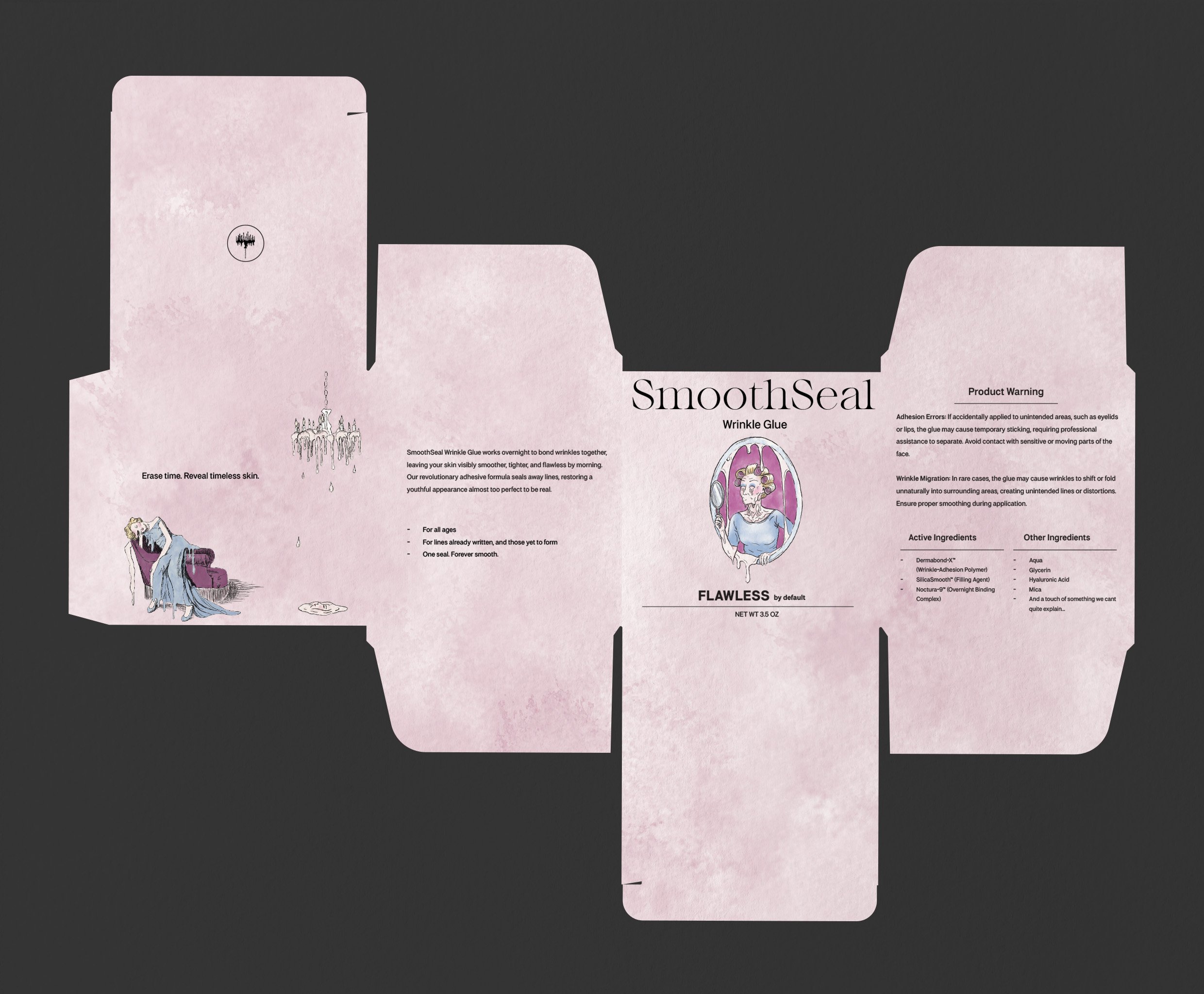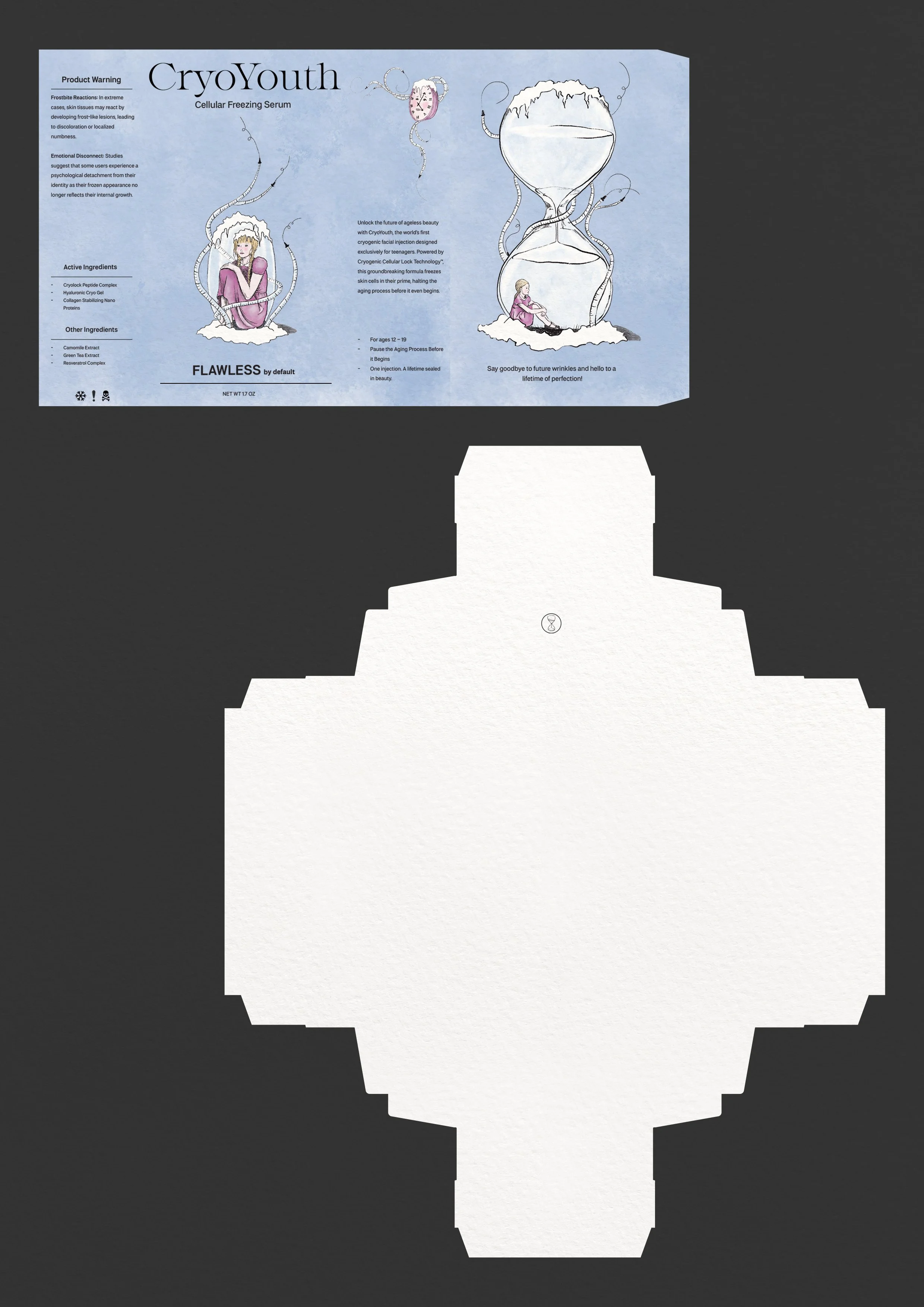 Flawless by Default is a satirical branding and packaging design project that critiques society’s obsession with youth and homogenized beauty ideals in the age of social media. Through a fictional beauty brand selling extreme anti-aging products, CryoYouth, a cellular freezing injection for teenagers, and SmoothSeal, a wrinkle glue—I created two illustrated product boxes with matching sticker labels. The brand identity is supported by promotional posters and animated videos for each product, using humour and exaggeration to challenge conformity and spark conversation around unrealistic beauty standards.